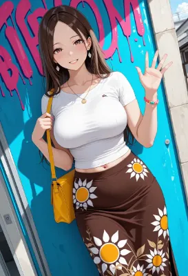 masterpiece, best quality, very aesthetic, absurdres, japanese beautiful adult woman, brown hair, ponytail, parted bangs, Voluminous breasts, skindentation, (cleavage:0.8), diner worker, short sleeves, collared shirt, thick vertical-striped shirt, tight sleeves, skirt, apron, stud earrings, name tag, light pink nails, (sweat:0.6), smile, open mouth, Standing ,table, offering menu, indoors, dutch angle, close-up,