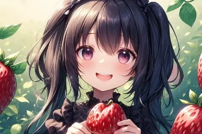 (Very cute girl:1.3),strawberry picking,Drooling and staring at the strawberries with the biggest smile on his face,
