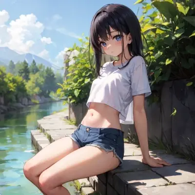 1girl,solo,cute female child,8 yo, black hair, ponytail,white shirt,white socks, gym uniform,dark blue buruma, sports shoes, standing,outdoors, blue sky,sweat, from behind, from below,