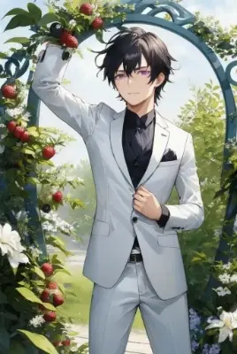 青年男性、大人年齢30代、目は紫色、つり目でクール、整った黒髪短髪、服黒スーツ、黒ネクタイ、白いシャツ、朝日、燃えるような朝日