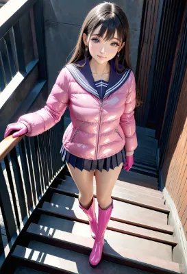 (photorealistic:1.4), (RAW photo), masterpiece, best quality, extremely detailed, lady, neat and clean, elegant, polite, (shy:0.9), black medium length hair, almond eyes, (smile:0.9), slim fit, hooded, high necked, closed zipper, (shiny purplish dark red short puffer down jacket), long leather skirt, (thin pantyhose:0.6), (platform long boots), diagonal back view, looking back, riding escalator, low angle shot, department store, down jacket shop in the background