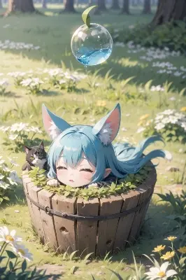 incredibly absurdres, highres, best quality, ultra detailed, chibi, kawaii, In a meadow with a giant fruit, a small fairy stands looking up at it, amazed by its size.