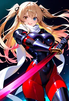 masterpiece, Fire Emblem style, (perfect anatomy), extremely detailed girl. sword master, cowboy shot, Contrapposto, from side. looking away, extremely detailed face. A dignified expression, smile, kawaii. opened mouth, (light-pink lips:0.8). detailed hair, (darkblue hair), (Ahoge), long hair, (hair between eyes), extremely detailed eyes, blue eyes. clear eyes, white Hairband, (Fair skin), Healthy Skin, Shiny Skin. medium breasts. The character is wearing a white cuirass, breastplate, (red clothes:1.2), white Shoulder Armor. Short sleeve, shorts, white thigh-high socks, long boots. nice hand. extremely detailed Steel sword. sword fighting, Hands holding weapon, Holding a Steel sword, two-handed, clutching Steel sword with both hands, aiming a Steel sword at viewer, dynamic angle, beautiful digital artwork, high quality fantasy art, exquisite character art, , , <lora:hairdetailer:1> <lora:eyecolle_begonia_v100:1> <lora:saturation:0.5>