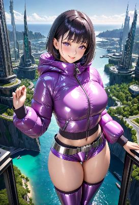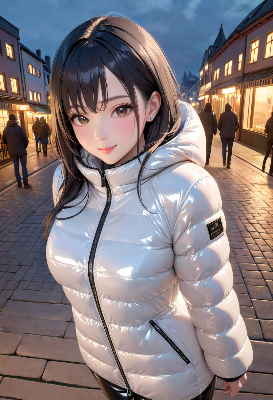 (photorealistic:1.4), (RAW photo), masterpiece, best quality, extremely detailed, lady, neat and clean, elegant, polite, (shy:0.8), black long hair, almond eyes, (smile:0.8), slim fit, hooded, high necked, closed zipper, (shiny black long puffer down coat), enamel long boots, standing pose, (high angle shot:0.8), stylish town, good view, cold evening, dusk, twilight