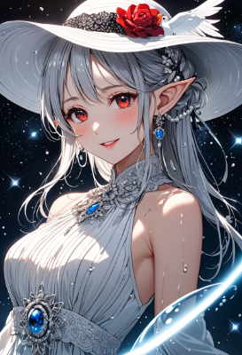 8K resolution, ((perfectly aligned fingers)),((cinematiclight,masterpiece,best quality,Ultra extremely detail everything ,perfect anatomy,high-resolution,highres,extremely detailed,sharp focus)),(((high-contrast:1.6,strong back-light, flower print ,zoom-up head and close-up hair, child elf wearing glossy decoration glitter gorgeous silk fabric stripe long-silk-dress to with brilliant sequins,very large gothic ribbon ,wthte unserwear,wearing sandal))),looking at viewer:1.5,(best detailed surprised red Eyes with reflection), (messy ahoge ),pompadour-like hair style white hair with Ahoge,elf ear with big earrings ,wetting face,blush,lipstick,Skin Gloss and skin is soaking wet, wet-lip,big hip,smile,open mouth ,small breasts,armpit ,Sweat,looking at viewer,Skin Gloss at legs and body and face , BREAK,Cloudy,lightning,BREAK,(big Bubbles),BREAK,blooming white rose farm,BREAK,flying white birds,strong Reflection universe),BREAK,blue sky with planet,universe,platets,galaxy,<lora:hohoaka:1> <lora:make25d_type1_v100:1>,,