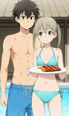 Boy, girl, couple,A couple dances to a distant beach band’s music on a warm midsummer evening beach. The girlfriend wears a flowy crochet cover-up over a white bandeau bikini, her smile radiant. Her boyfriend, in navy board shorts, playfully spins her and dips her low, causing her to laugh with pure joy. Tiki torches flicker in the background.