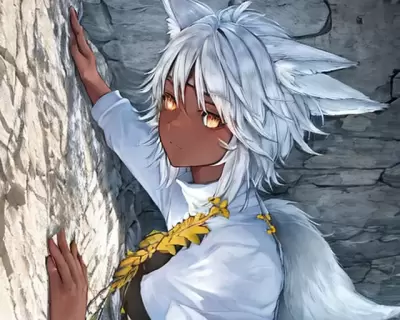 (flat color)++, mountain, (masterpiece)+, hyperrealistic, (novel illustration)++, (brave female)+, (solo)+++, (dark-skinned girl)+, (fox ears)+, (white hair)++, short hair, (simple white turtleneck t-shirt)++,(detailed face)+, (realistic eyes)+, small chest, sharp eyes,