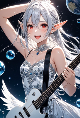8K resolution, ((perfectly aligned fingers)),((cinematiclight,masterpiece,best quality,Ultra extremely detail everything ,perfect anatomy,high-resolution,highres,extremely detailed,sharp focus)),(((high-contrast:1.6,strong back-light, flower print ,from-front and zoom-up mouth and close-up hair, child elf wearing glossy decoration glitter gorgeous silk fabric stripe long-silk-dress to with brilliant sequins,very large gothic ribbon ,wthte unserwear,wearing sandal))),looking at viewer:1.5,(best detailed surprised red and heterochromia Eyes with reflection), (messy white hair with Ahoge),elf ear with big earrings ,wetting face,blush,lipstick,Skin Gloss and skin is soaking wet, wet-lip,big hip,smile,(open mouth with double teeth) ,small breasts,armpit ,Sweat,looking at viewer,Skin Gloss at legs and body and face , BREAK,Cloudy,lightning,music,BREAK,(big Bubbles),BREAK,blooming white rose farm,flying white birds,strong Reflection universe),BREAK,blue sky with planet,universe,platets,galaxy,<lora:hohoaka:1> <lora:make25d_type1_v100:1>,,,,