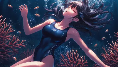 Detailed anime-style image of a girl of Asian descent unable to hold her breath while swimming at the bottom of the Coral Sea in night. She is wearing a sleek competitive sleeveless metallic blue swimsuit and has short, flowing black hair with high ponytail. She appears to be exhaling or struggling underwater, with many air bubbles escaping from her mouth. She closes eyes. She is completely upside down. Best Quality.