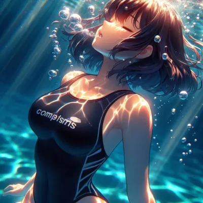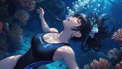 A detailed anime-style image of a girl of Asian descent bottom of reef. The image captures her whole body depicting her struggling to hold her breath. Her short flowing hair moves around her in the water. She is slightly exhaling with many small bubbles escaping from her mouth. She wears a sleek competitive sleeveless black swimsuit. The lighting reflects the underwater environment with vibrant dappled light patterns reflecting off her skin. She closes eyes