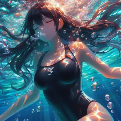 A detailed anime-style image of a girl of Asian descent bottom of reef. The image captures her whole body depicting her struggling to hold her breath. Her short flowing hair moves around her in the water. She is slightly exhaling with many small bubbles escaping from her mouth. She wears a sleek competitive sleeveless black swimsuit. The lighting reflects the underwater environment with vibrant dappled light patterns reflecting off her skin. She closes eyes
