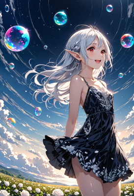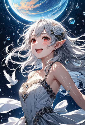 8K resolution, ((perfectly aligned fingers)),((cinematiclight,masterpiece,best quality,Ultra extremely detail everyone ,perfect anatomy,high-resolution,highres,extremely detailed,sharp focus)),(((high-contrast:1.6,strong back-light, flower print ,from-front and zoom-up mouth and close-up hair, child elf wearing glossy decoration glitter gorgeous silk fabric stripe long-silk-dress to with brilliant sequins,very large gothic ribbon ,wthte unserwear,wearing sandal))),looking at viewer:1.5,(best detailed surprised red Eyes with reflection), (messy white hair with Ahoge),elf ear with big earrings ,wetting face,blush,lipstick,Skin Gloss and skin is soaking wet, wet-lip,big hip,smile,(open mouth with double teeth) ,small breasts,armpit ,Sweat,looking at viewer,Skin Gloss at legs and body and face , (((Tilt Head and singing enthusiastically))),tilt head,BREAK,Cloudy,lightning,music,BREAK,(big Bubbles),BREAK,blooming white rose farm,flying white birds,strong Reflection universe),BREAK,blue sky with planet,universe,platets,galaxy,<lora:hohoaka:1> <lora:make25d_type1_v100:1>,,,