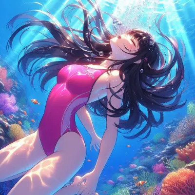 Anime-style image of a girl swimming upwards towards the sea surface, wearing a navy blue and black bikini with dots pattern and a hip frill. Her long hair flows elegantly behind her in the water, and her expression conveys peace and wonder. The underwater scene is vibrant and colorful, filled with marine life like fish and corals. The perspective captures the beauty of the underwater environment.