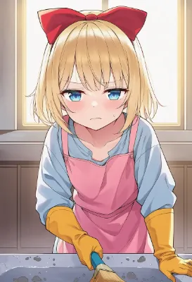 1girl,solo,blond hair,short hair,(hair bow:1.4),(red bow:1.3),blue eyes,(cheerful expression:1.2),bright smile,concentrated face,working diligently,anime style,delicate features,medium chest,(cute uniform:1.2),pastel colored work outfit,apron,name tag,cap or headband,holding soft serve machine,(making ice cream:1.3),one hand operating machine,other hand holding cone,standing behind counter,feet in comfortable work shoes,food stall background,(ice cream stand:1.2),colorful menu board,refrigeration units,summer festival atmosphere,outdoor food court,bright daylight,cheerful working environment,sweet shop setting,(masterpiece:1.2),(best quality:1.3),(very aesthetic:1.2),(absurdres:1.1),