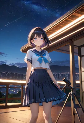 masterpiece, best quality, ultra-detailed, 8k, high resolution, extremely fine and beautiful design, extremely fine and beautiful colors, cinematic lighting, dynamic production, 1girl (1.2), schoolgirl (1.1), Sailor Uniform, black hair, short hair, blue eyes, summer sleeve, roof, night, starry sky, telescope,天体観測, school, premium performance, looking at the sky, <lora:saturation:0.3>, <lora:hyperdetailer_v060.safetensors:0.4>