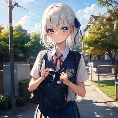 very cute female child,10 yo, white hair, bangs,medium hair,blue eyes, flat chest,