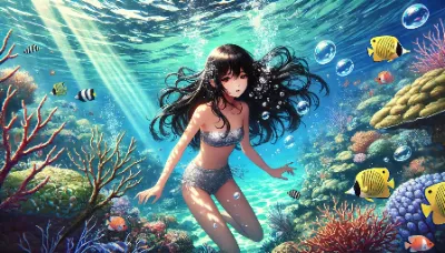 Anime-style illustration of an Asian girl underwater at the bottom of the Coral Sea. She is wearing a simple two-piece orange bikini with a floral pattern. Her long, flowing black hair drifts around her as she struggles to hold her breath. Her eyes are closed, and she appears to be exhaling, with many bubbles escaping from her mouth. The scene is bathed in vibrant sunlight patterns filtering through the water, illuminating the surroundings. Colorful tropical fish swim nearby, and a variety of aquatic plants decorate the ocean floor. The atmosphere is vivid and serene, yet slightly tense.