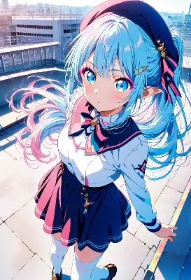 masterpiece, best quality (1.2), ultra-detailed, high resolution, 8k, anime, girl (1.2), gradation color gothic lolita (1.1), Prussian blue hair (1.1), inner color hair, blue eyes (1.1), hime cut, elf, bobcut, white stockings, earrings, makeup, ribbon, moe sleeves, sleeveless top, nail, rays of light, bedroom, pillow, looking at viewer, <lora:hairdetailer:1>, <lora:noline:1>
