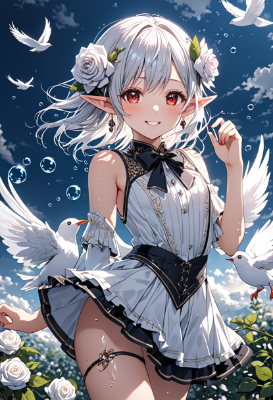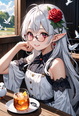8K resolution, ((perfectly aligned fingers)),((cinematiclight,masterpiece,best quality,Ultra extremely detail everyone ,perfect anatomy,high-resolution,highres,extremely detailed,sharp focus)),((high-contrast:1.6,strong back-light, flower print)) ,((from above:1.5 and extreme close-up hand:1.5 and extreme zoom-up finger , detective child elf wearing glossy decoration glitter gorgeous silk fabric hero-suit to with brilliant sequins,wearing very large gothic violet ribbon of rose form on head,see-through very short-skirt ,wearing white long over High knee sox,wthte unserwear,wearing large glasses,wearing sandal)),(best detailed red Eyes with reflection), (messy platinum white hair with Ahoge),elf ear with big red earrings ,wetting face,blush,lipstick,Skin Gloss and skin is soaking wet, wet-lip,big hip,smile and Look at viewer in a friendly way,small breasts,armpit ,Sweat,Skin Gloss at legs and body and face ,BREAK,((front of cafe in the town)),BREAK,Cloudy,lightning,big Bubbles,BREAK,ice-tea on dish on table,blooming white rose farm,flying white birds,BREAK,blue sky ,<lora:hohoaka:1> <lora:make25d_type1_v100:1>,,,