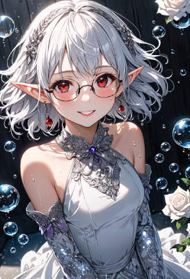 8K resolution, ((perfectly aligned fingers)),((cinematiclight,masterpiece,best quality,Ultra extremely detail everyone ,perfect anatomy,high-resolution,highres,extremely detailed,sharp focus)),((high-contrast:1.6,strong back-light, flower print)) ,((from above:1.5 and extreme close-up hand:1.5 and extreme zoom-up finger , detective child elf wearing glossy decoration glitter gorgeous silk fabric hero-suit to with brilliant sequins,wearing very large gothic violet ribbon of rose form on head,see-through very short-skirt ,wearing white long over High knee sox,wthte unserwear,wearing large glasses,wearing Metal-armor,wearing sandal)),(best detailed red Eyes with reflection), (messy platinum white hair with Ahoge),elf ear with big red earrings ,wetting face,blush,lipstick,Skin Gloss and skin is soaking wet, wet-lip,big hip,smile and Look at viewer in a friendly way,small breasts,armpit ,Sweat,Skin Gloss at legs and body and face ,BREAK,((front of cafe in the town)),BREAK,Cloudy,lightning,big Bubbles,BREAK,ice-tea on dish on table,blooming white rose farm,flying white birds,BREAK,blue sky ,<lora:hohoaka:1> <lora:make25d_type1_v100:1>,,