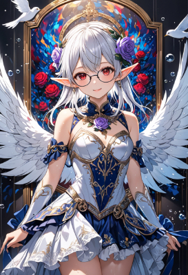 8K resolution,steampunk:1,5, ((perfectly aligned fingers)),((cinematiclight,masterpiece,best quality,Ultra extremely detail everyone ,perfect anatomy,high-resolution,highres,extremely detailed,sharp focus)),((high-contrast:1.6,strong back-light, flower print)) ,((from above:1.5 and extreme close-up hand:1.5 and extreme zoom-up finger , detective child elf wearing glossy decoration glitter gorgeous silk fabric hero-suit to with brilliant sequins,wearing very large gothic violet ribbon of rose form on head,see-through very short-skirt ,wearing white long over High knee sox,wthte unserwear,wearing large glasses,wearing metaric-armor,wearing sandal)),(best detailed red Eyes with reflection), (messy platinum white hair with Ahoge),elf ear with big red earrings ,wetting face,blush,lipstick,Skin Gloss and skin is soaking wet, wet-lip,big hip,smile and Look at viewer in a friendly way,small breasts,armpit ,Sweat,Skin Gloss at legs and body and face ,BREAK,,steampunk:1,5, ,BREAK,Cloudy,lightning,big Bubbles,BREAK,ice-tea on dish on table,blooming white rose farm,flying white birds,BREAK,blue sky ,<lora:hohoaka:1> <lora:make25d_type1_v100:1>,,