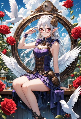 8K resolution,Atmosphere of steampunk:1,5, ((perfectly aligned fingers)),((cinematiclight,masterpiece,best quality,Ultra extremely detail everyone ,perfect anatomy,high-resolution,highres,extremely detailed,sharp focus)),((high-contrast:1.6,strong back-light, flower print)) ,((from above:1.5 and extreme close-up hand:1.5 and extreme zoom-up finger , detective child elf wearing glossy decoration glitter gorgeous silk fabric hero-suit to with brilliant sequins,wearing very large gothic violet ribbon of rose form on head,see-through very short-skirt ,wearing white long over High knee sox,wthte unserwear,wearing large glasses,wearing metaric-armor,wearing sandal)),(best detailed red Eyes with reflection), (messy platinum white hair with Ahoge),elf ear with big red earrings ,wetting face,blush,lipstick,Skin Gloss and skin is soaking wet, wet-lip,big hip,smile and Look at viewer in a friendly way,small breasts,armpit ,Sweat,Skin Gloss at legs and body and face ,BREAK,,steampunk:1,5, ,BREAK,Cloudy,lightning,big Bubbles,BREAK,ice-tea on dish on table,blooming white rose farm,flying white birds,BREAK,blue sky ,<lora:hohoaka:1> <lora:make25d_type1_v100:1>,,,,