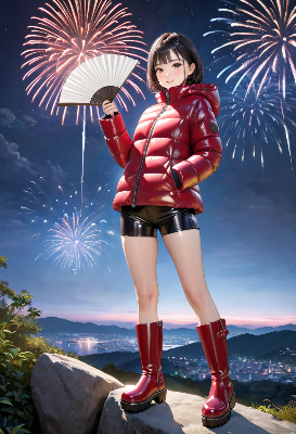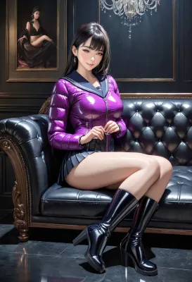 (photorealistic:1.4), (RAW photo), masterpiece, best quality, extremely detailed, lady, office clerk, company employee, neat and clean, elegant, polite, (shy:0.9), black long hair, almond eyes, (smile:0.9), slim fit, (short sleeves white shirt), closed zipper, (shiny navy puffer life vest:1.3), tight mini skirt, (thin pantyhose:0.7), (elbow length gloves:1.3), (platform long rubber boots:1.2), sit on chair, (low angle shot:0.8), cocktail drink on desk, clean office, working people in the background