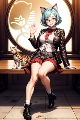 ((detailed facial features)), ((perfect female figure)), ((perfect anatomy)), ((masterpiece)), ((best quality)), ultra detailed, high resolution:1.8, intricate detail, ultra detailed skin, (cute:1.4), (open mouth):1.5, 1 girl, (solo:1.5), (((dog ear:1.5))), brown eyes, detailed face, beautiful eyes, (slanted eyes:1.2), large breasts, glasses, stilettos, <lora:flat2:-0.5> BREAK from above, looking back, face focus, BREAK, ringlets, colored inner hair, asymmetrical bangs, surf shirt, spencer jacket, whilte pique vest, obi belt, flare skirt, knee high boots, knee sock, wariza, lying, outstretched arms, crossed arms, cloudy, museum,