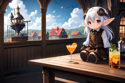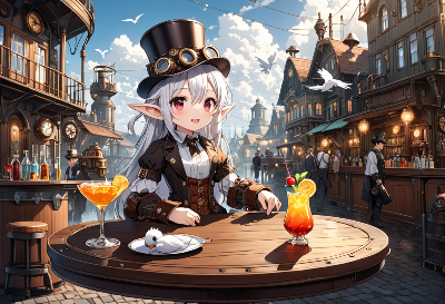 8K resolution,Atmosphere of steampunk:1,5, ((perfectly aligned fingers)),((cinematiclight,masterpiece,best quality,Ultra extremely detail everyone ,perfect anatomy,high-resolution,highres,extremely detailed,sharp focus)),((high-contrast:1.6,strong back-light, flower print)) ,((from above:1.5 and extreme close-up hand:1.5 and extreme zoom-up finger , detective child elf wearing glossy decoration glitter gorgeous silk fabric hero-suit to with brilliant sequins,wearing very large gothic violet ribbon of rose form on head,see-through very short-skirt ,wearing white long over High knee sox,wthte unserwear,wearing large glasses,wearing metaric-armor,wearing sandal)),(best detailed red Eyes with reflection), (messy platinum white hair with Ahoge),elf ear with big red earrings ,wetting face,blush,lipstick,Skin Gloss and skin is soaking wet, wet-lip,big hip,wide open mouth,smile and Look at viewer in a friendly way,small breasts,armpit ,Sweat,Skin Gloss at legs and body and face ,have plush toy,BREAK,((stuffed toy , plush toy and cocktail on the table,steampunk:1,5, steampunk town)),BREAK,Cloudy,lightning,big Bubbles,BREAK,ice-tea on dish on table,blooming white rose farm,flying white birds,BREAK,blue sky ,<lora:hohoaka:1> <lora:make25d_type1_v100:1>,,,,