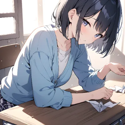 (masterpiece), (best quality), full-body portrait, traditional japanese garden, black-haired girl, short bob, slim figure, wearing a soft pink yukata with origami pattern, kneeling on a stone path, (surrounded by origami animals), serene face, natural lighting, tranquil background