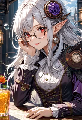 8K resolution,Atmosphere of steampunk:1,5, ((perfectly aligned fingers)),((cinematiclight,masterpiece,best quality,Ultra extremely detail everyone ,perfect anatomy,high-resolution,highres,extremely detailed,sharp focus)),((high-contrast:1.6,strong back-light, flower print)) ,((from_below:1.5 and extreme close-up hairpin:1.5 and extreme zoom-up finger , detective child elf wearing glossy decoration glitter gorgeous silk fabric hero-suit to with brilliant sequins,wearing very large gothic violet ribbon of rose form on head,see-through very short-skirt ,wearing white long over High knee sox,wthte unserwear,wearing large glasses,wearing dragon-scale-armor,wearing sandal,and wearing hairpin in head)),(best detailed red Eyes with reflection), (messy platinum white hair with hair-pin),elf ear with big red earrings ,wetting face,blush,lipstick,Skin Gloss and skin is soaking wet, wet-lip,big hip,wide open mouth,smile and Look at viewer in a friendly way,small breasts,armpit ,Sweat,Skin Gloss at legs and body and face,multiple star shape large hair-clip,hairpin,BREAK, ((Japanese-style papercraft and cocktail on the table)),steampunk:1,5, steampunk town,Origami,BREAK,(((paper craft of origami on table))),Cloudy,lightning,big Bubbles,BREAK,blooming white rose farm,flying white birds,<lora:hohoaka:1> <lora:make25d_type1_v100:1>,,,