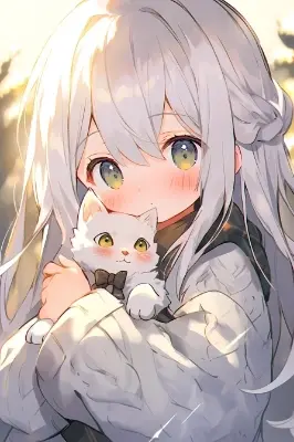 Profile, smiling, long silver hair, blue-eyed girl crouching, looking at hydrangea, hydrangea field, umbrella on shoulder, rain, smiling, wearing school uniform, profile, cloudy sky, smiling --ar 2:3