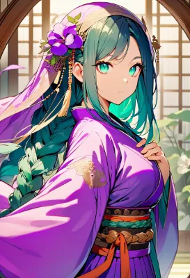 masterpiece, best quality, extremely detailed, high resolution, beautiful face, Japanese anime,1girl, (solo:1.3), cowboy shot, ((no hat:1.3)), BREAK ((purple-red hair:1.3)), (big red ribbon, two side up:1.3), BREAK (wearing peony flowers 1hair ornament:1.3), BREAK ((purple-red hair:1.3)), BREAK (tsurime, with eyelashes), (beautiful detailed eyes:1.2), (v-shaped eyebrows), frown, (open mouth), large breasts, (Slightly Muscular), 17 -year-old, 168cm tall, original character, fantasy, BREAK (beautiful fingers:1.3), (fighting pose:1.4), (red boxing gloves:1.3), BREAK (red kimono:1.3), (orange 1obi), BREAK (outdoor background:1.3), (lots of peony flowers:1.4), looking at viewer