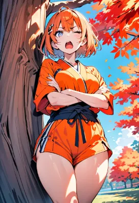 masterpiece, best quality, extremely detailed, high resolution, beautiful face, Japanese anime,1girl, 8k, 16k, cowboy shot, ((no hat:1.3)), BREAK ((yellow hair:1.3)), (shaggy, short hair:1.3), BREAK (wearing chrysanthemum flowers 1hair ornament:1.3), BREAK (tsurime, with eyelashes), (beautiful detailed eyes:1.2), (round eyes:1.5), squinting, (nose blush), (open mouth), (getting drunk:1.3), small breasts, (Slightly Muscular), 19 -year-old, 158cm tall, original character, fantasy, BREAK (beautiful fingers:1.3), (holding big Sake cup:1.4), BREAK (getting down on knee:1.4), BREAK (Night, Bar Room Background:1.3), BREAK (off shoulder, bright yellow kimono:1.3), (white waist strap:1.2), (bare thighs:1.3), (bare breasts:1.2), BREAK (lots of chrysanthemum flowers:1.3), looking at viewer,sarashi,score_9,score_8_up,score_7_up,source_anime, BREAK (sarashi:1.3), drunk bubbles,alcohol