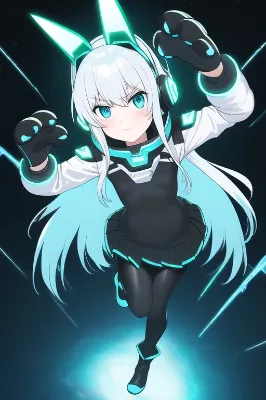 masterpiece, best quality, masterpiece, best quality, anime face, 1girl, {{beautiful eyes}}, {{cyber blue fox ear shape mechanical headgear}}, fake animal ears, {white medium-long hair}, {straight hair with fox ear shape headgear on headphone}, flat chest, aqua eyes, {black oily (between the sea and the sky (anime)) spacesuit costume}, {black and white skin-tight oily long sleeves bodysuit with blue line-trimmed}, {{black oily pleated skirt on bodysuit}}, full aqua spilit energy battery equipment at girl backpack unit, {black oily gloves}, black shiny pantyhose in boots, white shiny boots, space helmet attachment on neck, {{bodysuit without revealing}}, looking back at viewer, looking back, serious, light smile, [light blush], open hands, standing on cyber floor, open mouth, one eye closed,{cyber blue neon-light fox ear shape headgear}, cyber, character age 10, solo,