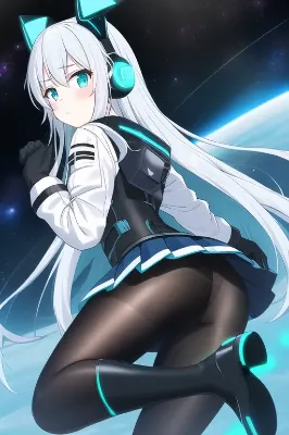 masterpiece, best quality, masterpiece, best quality, anime face, 1girl, {{beautiful eyes}}, {{cyber blue mechanical fox ear shape headgear}}, fake animal ears, {white medium-long hair}, {straight hair with fox ear shape headgear on headphone}, flat chest, aqua eyes, {black oily (between the sky and sea (anime)) spacesuit costume}, {black and white skin-tight oily long sleeves bodysuit shaped aqua fox spirit outfit with blue line-trimmed}, {{black oily pleated skirt on bodysuit}}, blue fox spiritual power equipment on girl back unit, {black oily gloves with blue spilitual power}, black shiny pantyhose under skirt and short boots, space helmet attachment on neck, {{bodysuit without revealing}}, looking back at viewer, looking back, incoming attack to viewer, serious, frown, open hand, {{blue spilitual power gloves}}, emitting blue fire-fox from gloves, hand up, standing on one leg, few open mouth, {cyber blue neon-light fox ear shape headgear}, cyber, character age 10, loli, solo, blue spilitual power telekinesis from gloves,