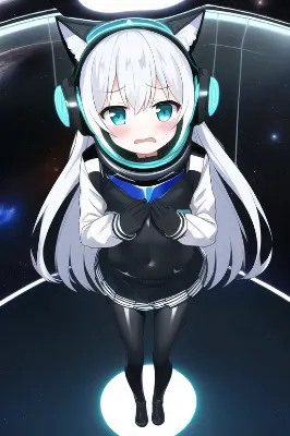 masterpiece, best quality, masterpiece, best quality, anime face, 1girl, {{beautiful eyes}}, {{cyber blue fox ear shape mechanical headgear}}, fake animal ears, {white medium-long hair}, {straight hair with fox ear shape headgear on headphone}, flat chest, aqua eyes, {black oily (between the sea and the sky (anime)) spacesuit costume}, {black and white skin-tight oily long sleeves bodysuit with blue line-trimmed}, {{black oily pleated skirt on bodysuit}}, empty aqua spilitual energy equipment at girl back side device, {black oily gloves}, black shiny pantyhose in boots, white shiny boots, {{bodysuit without revealing}}, looking back, incoming attack to viewer, serious, exhausted, open hands, {blue fire fox gloves}, standing on one leg, [few open mouth], [sweatdrop], {cyber blue neon-light fox ear shape headgear}, cyber, character age 10, loli, solo, blue spilit electrokinesis,