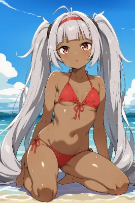 1 late teenage girl, red eyes, purplish-red hair, elf ears, {{{{low long pigtails}}}}, black bikini, medium breast, navel, standing, barefoot, outdoor, beach, clear sky, anime drawings, anime painting, anime coloring, very aesthetic, masterpiece, no text