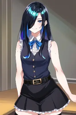 masterpiece, best quality, {full color, doujin, Perspective, detailed}, ink, manga, delicate, [hand-drawn], Shading, delicate black ink lines, detailed body shadows, manga-style, cowboy shot, from front , detailed cool face, {{ultra-detailed}}, shirt flowing locks, messy bangs, {{pupils sparkling, beautiful detailed eyes}}, {groin}, nsfw, 1bad girl, {{{{cute face}}}}, small breasts, [lip],{{hair over one eye}}, tired, {{ultra long shiny hair}}, {squinting eyes}, {evil smile}, [[[fangs]]] , standing, thighhighs, [muscular],{sweat}, cinematic, dramatic shadows, cinematic shadows, sunbeam, on the classroom, captivating beauty, {slender figure}, confident posture, {{realistic shading, natural lighting}}, lifelike, {{high-resolution image}}, {{delicate wisps of hair, Delicate and intricate lines hair}}, {dynamic pose}, {{{iridescent_color_hair}}}, {black hair}, black hair, blue hair, black hair, {blue hair}, tight, ribbon collar, detailed frilled White shirt , {sleeveless}, tight, {black frilled miniskirt}, such belt,