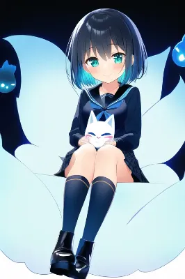 masterpiece, best quality, masterpiece, best quality, 1girl, anime face, full body, {{beautiful eyes}}, {dark-navy medium-short hair}, flat chest, dark-blue eyes, {{dark-navy long-sleeves serafuku with blue bow at breast}}, {dark-navy serafuku covered with a cyan hoodie}, navy and blue checkered pleated skirt, black kneehighs, navy shiny long boots on kneehighs, black shiny long boots, looking at viewer, looking to a crying fox ghost, sad, crying, {{holding a blue fox ghost on girl hands}}, sitting on circuit board, cyber, character age 10, loli, solo,