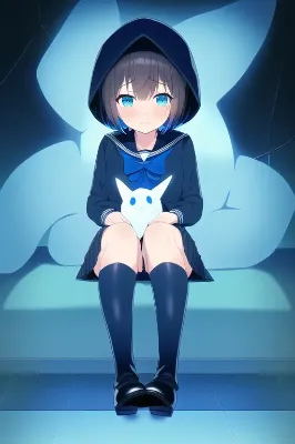 masterpiece, best quality, masterpiece, best quality, 1girl, anime face, full body, {{beautiful eyes}}, {dark-navy medium-short hair}, flat chest, dark-blue eyes, magical girl, {{dark-navy long-sleeves serafuku with blue bow at breast}}, {{serafuku covered with a cyan hoodie}}, navy and blue checkered pleated skirt, black kneehighs, dark-navy shiny long boots on kneehighs, looking at viewer, looking side, serious, light frown, few open mouth, holding a smartphone on one hand, standing on circuit board, cyber, chalacter age 10, loli, solo, holographic monitor, holographic interface, 1 blue giant fox ghost, girl full body swallowed by 1ghost,