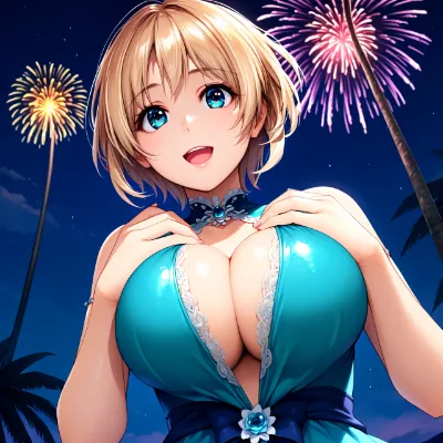 ultra detailed, top quality, masterpiece, aesthetic, beautiful face, beautiful eyes, cute eyes, shiny hair, (4fingers:0.7), 1girl, voluptuous body, large breasts, fiona, light purple hair, long hair, purple eyes, <lora:fiona:0.6>, gold dress, glitter dress, looking up, happy, open mouth, hand on breast, from below, fireworks, beach side, resort area, (night:1.1), add more details, <lora:Add_more_details_pony:0.4>, 16k, score_9, score_8_up, score_7_up