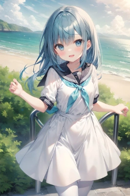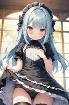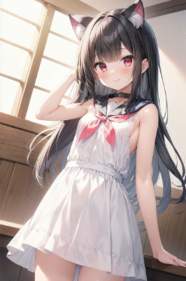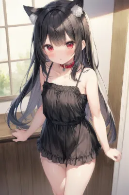 1girl, masterpiece, best quality, ultra-detailed, kawaii, lovely, game cg, 14years old, cat ear:1.5, small chest:1.3, red eyes, black hair, long hair, hair intakes:1.3, red collar:1.3, BREAK,Frilled maid outfit:1.5,striped pattern panties,thigh high socks,squatting down,showpanties,looking at viewer,from below,from front,