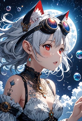 8K resolution,Atmosphere of steampunk:1,5, ((perfectly aligned fingers)),((cinematiclight,masterpiece,best quality,Ultra extremely detail everyone ,perfect anatomy,high-resolution,highres,extremely detailed,sharp focus)),((high-contrast:1.6,strong back-light, flower print)) ,((from above:1.5,extreme close-up cat ears:1.5 and extreme zoom-up ear,little child elf wearing glossy decoration glitter gorgeous silk fabric light-blue-color gothic ballet-suit to with brilliant sequins,wearing very large gothic ribbon of rose form on head,see-through short-skirt ,wthte unserwear,wearing ,wearing see-through tights ,wearing smartwatch:1.5,wearing VR-Goggles:1.5, ring)),(best detailed red Eyes with Flashy mascara and reflection), (messy platinum white hair),elf ear with big red earrings ,wetting face,blush,lipstick,Skin Gloss and skin is soaking wet, wet-lip,big hip,wide open mouth,suprised smile and singing and Look at ring on finger,small breasts,armpit ,Sweat,tatoo-art printed Skin Gloss at legs and body and face and arms,bend legs,BREAK,(cat,cat ears ,space,the universe,moon,starts),BREAK,Cloudy,lightning,big Bubbles,BREAK,blooming white rose farm, <lora:hohoaka:1> <lora:make25d_type1_v100:1>,,,,