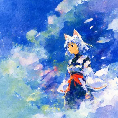 japanese anime, flat color, sunny day, transparent atmosphere, dynamical scene, beautiful queen, beautiful dark-skinned girl, wild girl, white japanese miko clothes, silk clothes, black neck undershirt, white hair, fox ears, thick eyebrows, happy, looking other side, --chaos 10 --sref 2645822389 --v 7 --stylize 400 --profile nqxtb7h