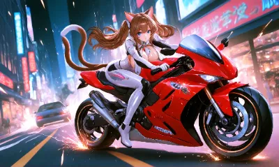 Pasture, giant UFO catcher lifting a surprised silver-haired cowgirl and a calico cat, anime-style, long hair, purple eyes, cow ears, horns, cowbell, black tail, cow-print satin pajamas, cow-print thigh-high socks, cow-print elbow gloves, sunny rural background,