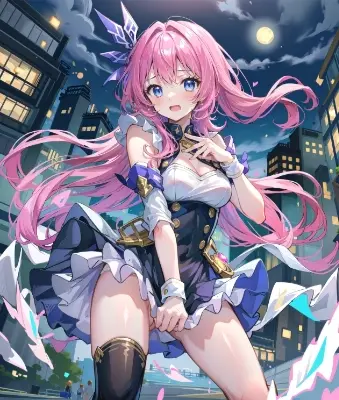 (masterpiece), (best quality:1.4), (ultra high res:1.2),(RAW photo:1.2), (sharp focus:1.3), (face focus:1.2), (Beautiful entertainment Mechanic City at night background:1.2),best quality, masterpiece,Fighting heroine,BREAK,<lora:Escalayer:0.1>,Escalayer,long hair,hair_ornament,blue eyes,pink dress,white long glove,thigh_boots,white panties,fighting stance,mecha musume, <lora:skirt_tug_v0.1:1>,clothes tug, wind, skirt tug,embarrassed,(panicking:1.2),open mouth