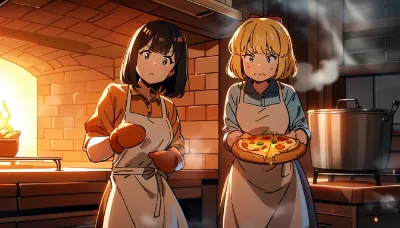 2girls,(hair bow:1.3),red bow,blonde hair,short hair,bob hair,blue eyes,black hair,short hair,dark eyes,young girls,cheerful expression,smiling faces,medium breasts,aprons over casual clothes,white aprons,flour dusted on clothes,rolling pins in hands,kneading pizza dough,stretching dough,flour scattered on counter,kitchen background,wooden counter,cooking utensils,warm kitchen lighting,cozy atmosphere,working together,side by side pose,hands covered in flour,concentrated expressions,anime style,detailed cooking scene,(masterpiece:1.2),(best quality:1.2),(very aesthetic:1.1),(absurdres:1.1),