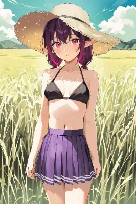 1 late teenage girl, red eyes, purplish-red hair, elf ears, {{{{low pigtails}}}}, black bikini, medium breast, bare shoulder, pleated high-waisted mini purple skirt, navel, purple skirt with two white lines, straw hat with wide brim, black socks with white line, brown loafers, standing, outdoor, field, clear sky, anime drawings, anime painting, anime coloring, very aesthetic, masterpiece, no text