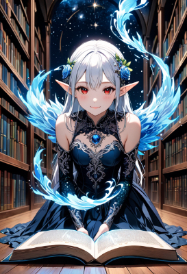 8K resolution,Atmosphere of fantasy:1,5, ((perfectly aligned fingers)),((cinematiclight,masterpiece,best quality,Ultra extremely detail everyone ,perfect anatomy,high-resolution,highres,extremely detailed,sharp focus)),((high-contrast:1.6,strong back-light, flower print)) ,((from side:1.5,extreme close-up ear:1.5 and extreme zoom-up ear, child elf wearing glossy decoration glitter gorgeous silk fabric gothic light-blue-color ballet-dress to with brilliant sequins,wearing very large gothic ribbon of rose form on head,see-through short-skirt ,white unserwear,wearing see-through tights ,wearing ear-phones with wire,head-phoneP)),(best detailed red Eyes with Flashy mascara and reflection), (messy platinum white hair),elf ear with big red earrings and earphone,wetting face,blush,enough lip with lipstick,Skin Gloss and skin is soaking wet, wet-lip:1.5,big hip,((bit opened mouth with smile)),small breasts,armpit ,Sweat,tatoo-art printed Skin Gloss at legs and body and face and arms,sitting on floor and spell magic,BREAK,((earphones,spellbook of magic on floor,space,the universe,moon,starts)),BREAK,((magic effects of blue fire,Library room)),BREAK,Cloudy,lightning,big Bubbles,BREAK,blooming white rose farm, <lora:hohoaka:1> <lora:make25d_type1_v100:1>,,,,,,,